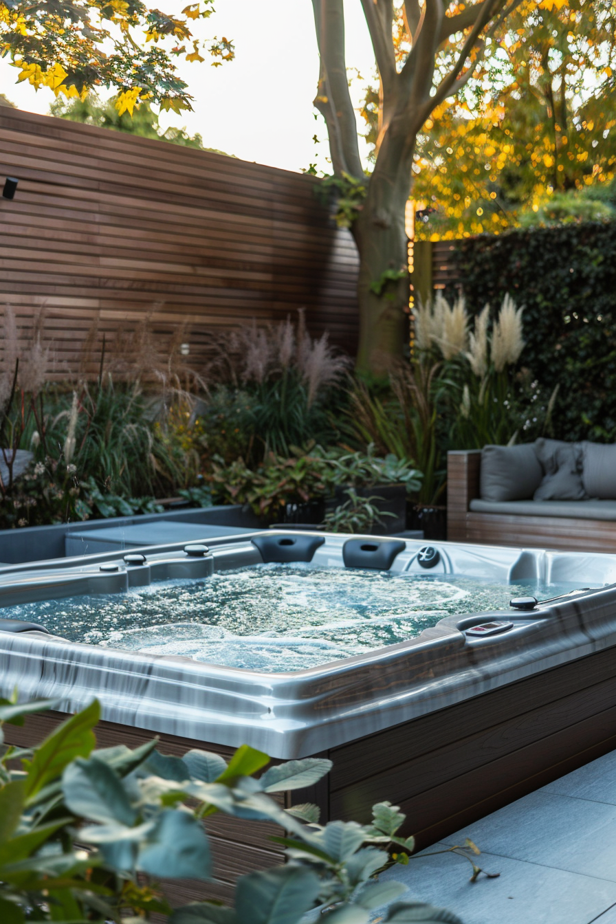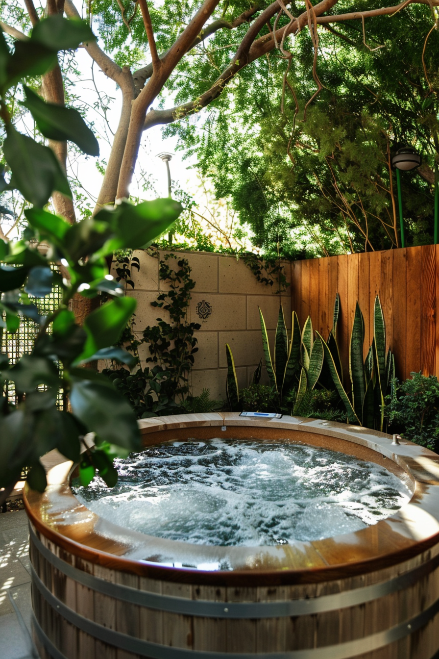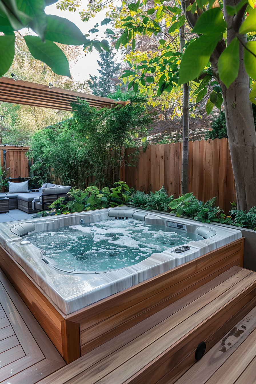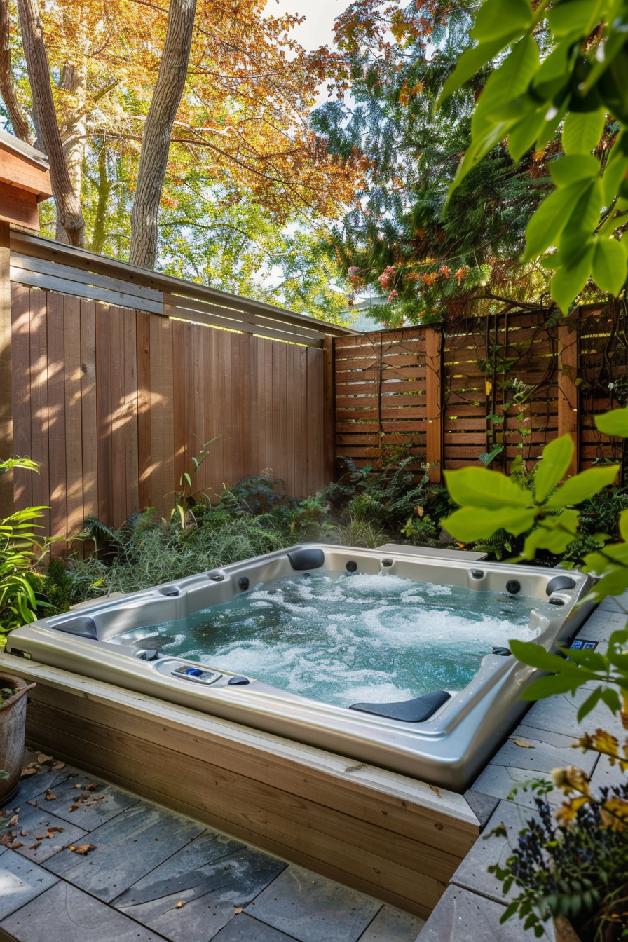 This sleek spa fits perfectly in a small patio, and there’s soft lighting that gives it a peaceful vibe. Stone paths lead you right to it, making it easy to step away from everything and just relax.