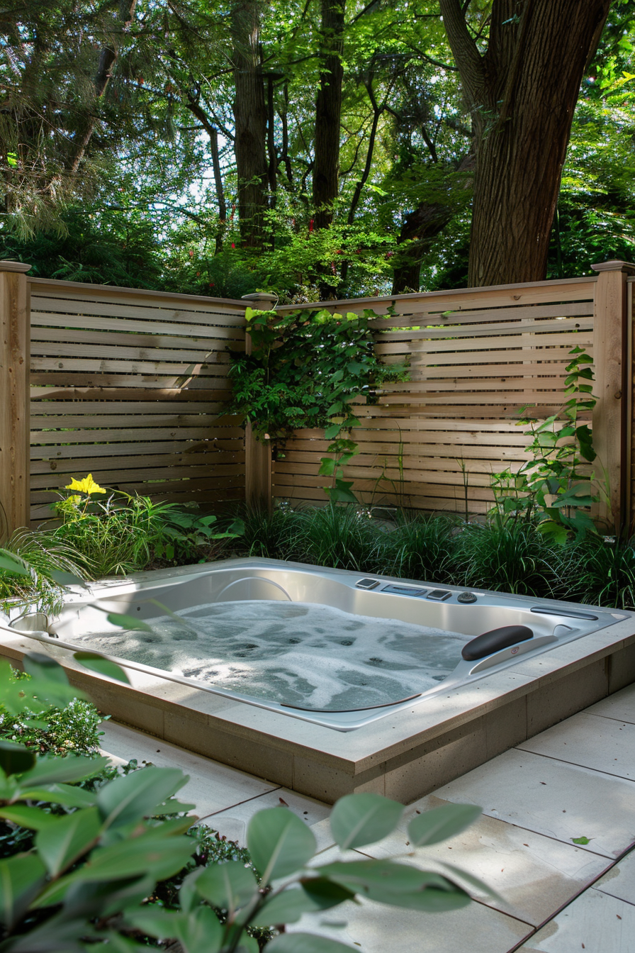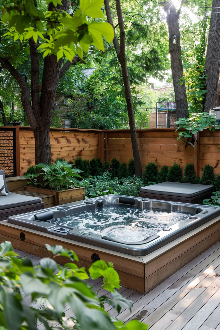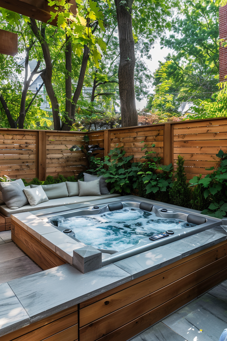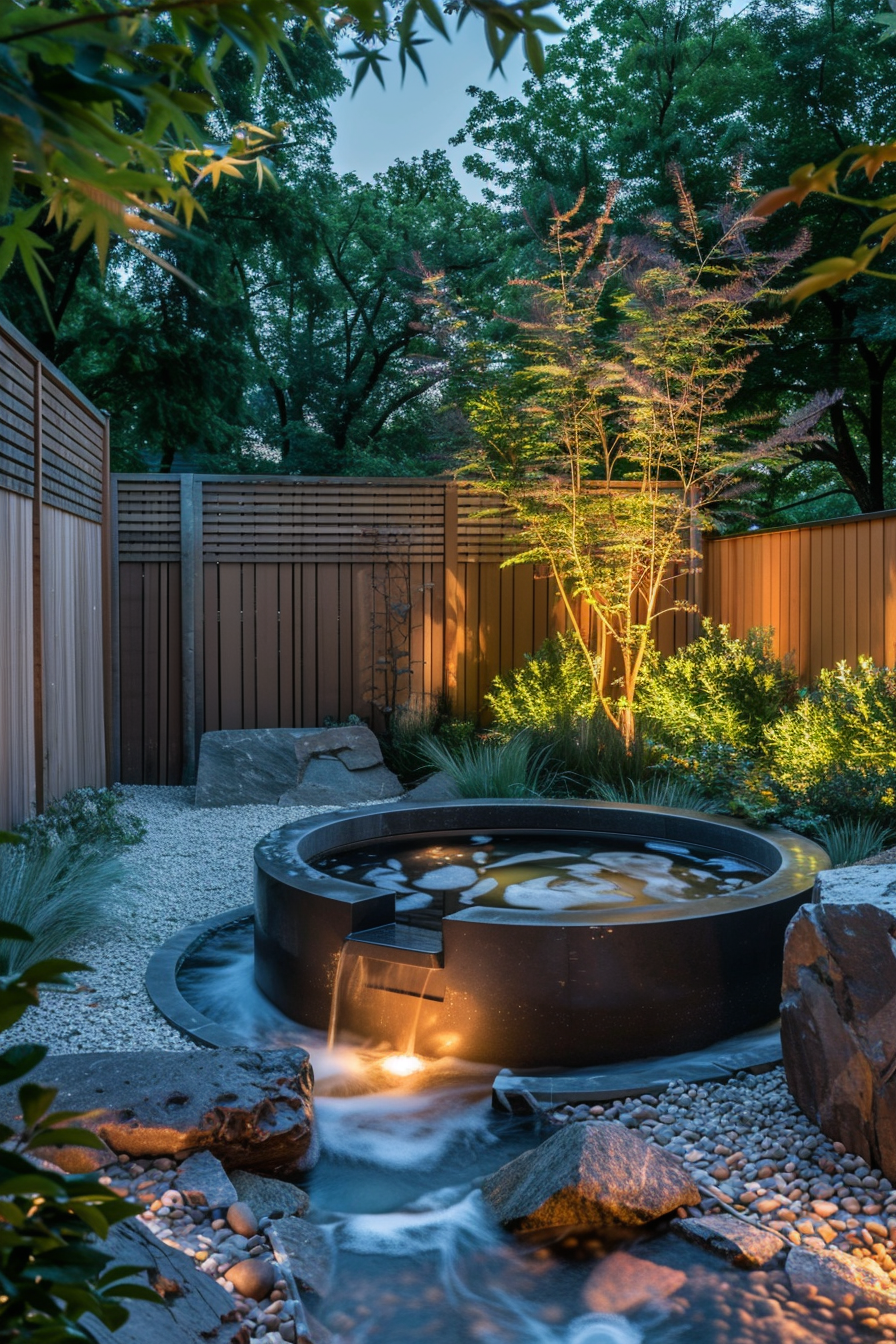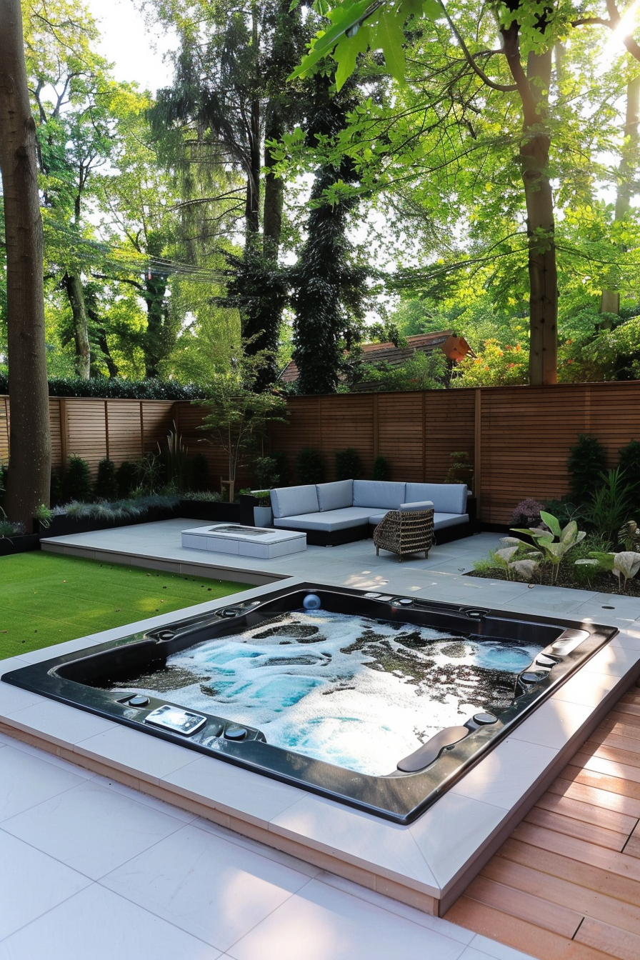 This sleek spa fits perfectly in a small patio, and there’s soft lighting that gives it a peaceful vibe. Stone paths lead you right to it, making it easy to step away from everything and just relax.