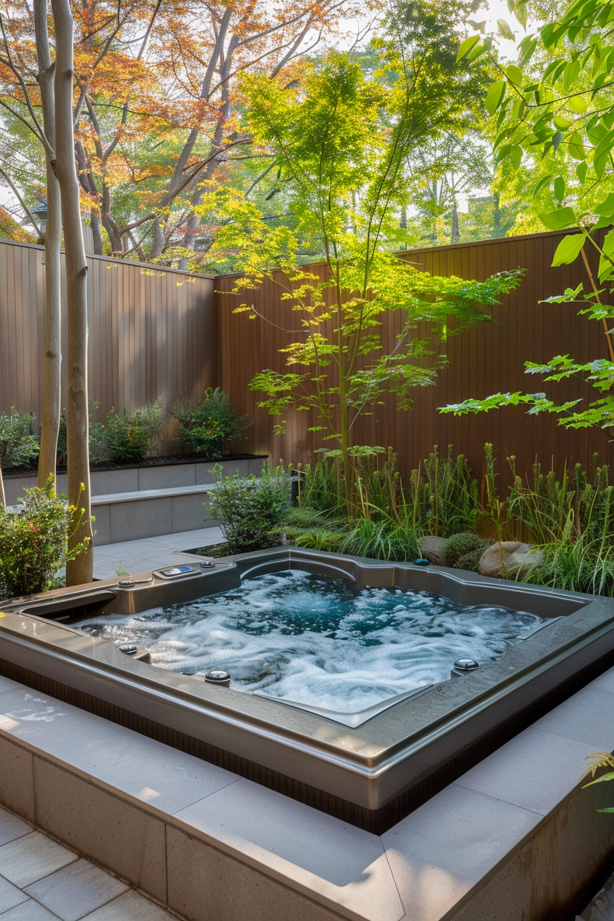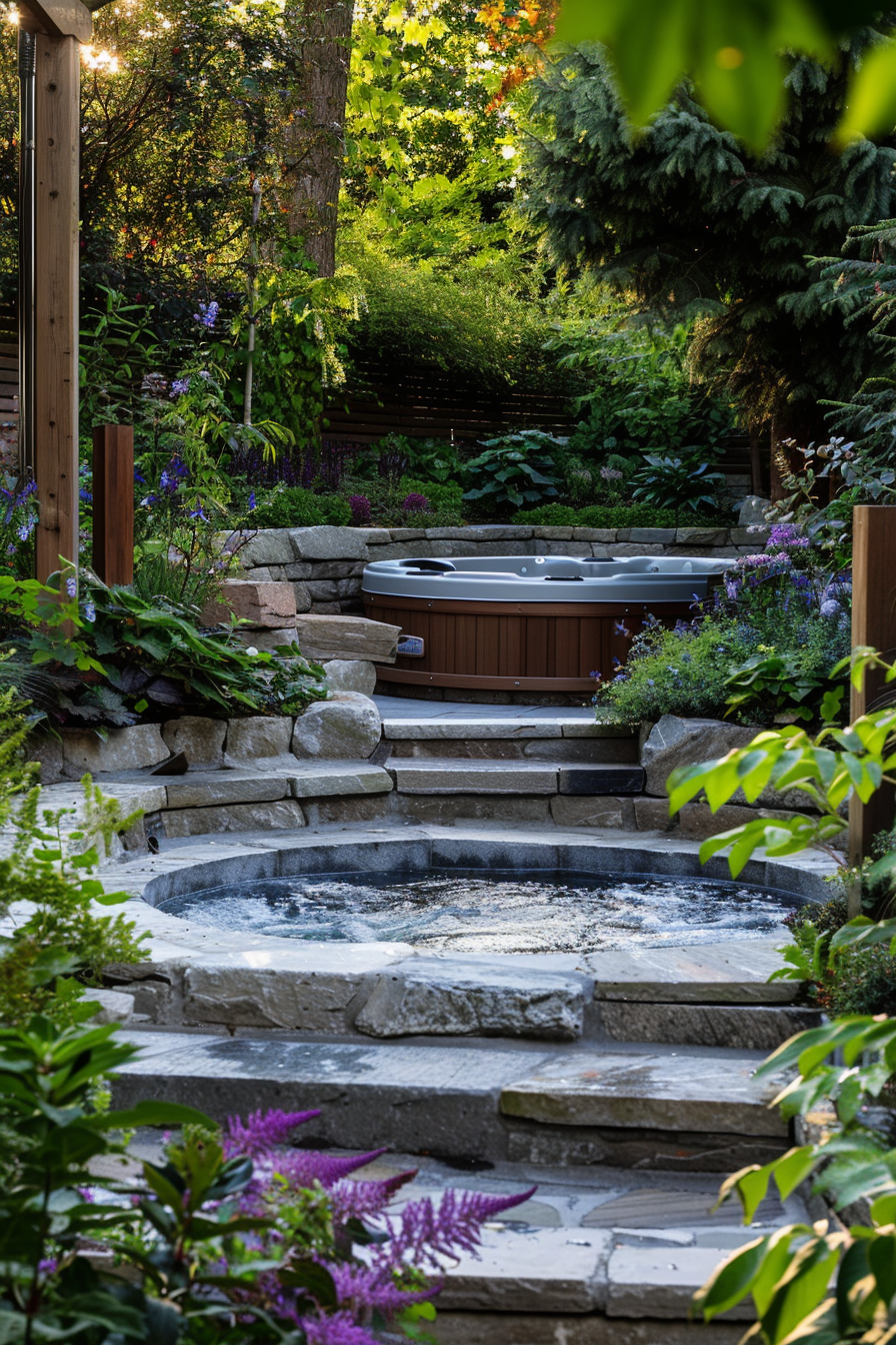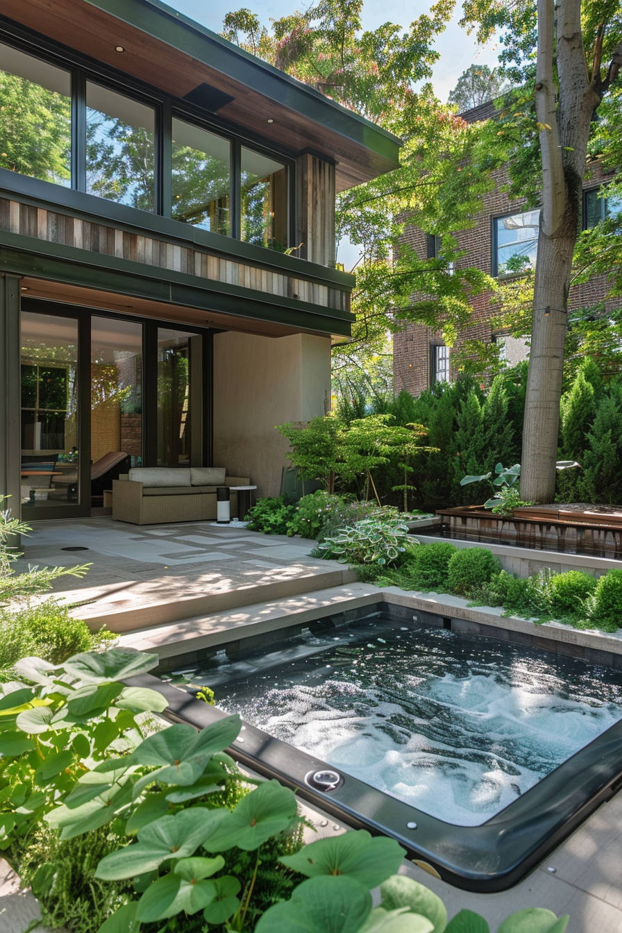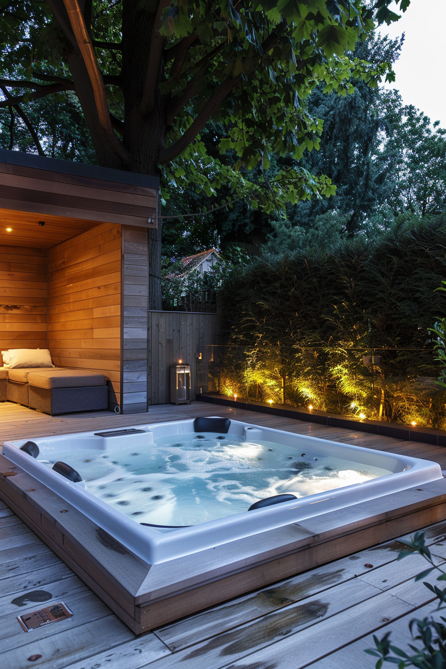 Here, a compact spa sits surrounded by lush greenery, with its soft glow reflecting off the water. Seasonal plants frame the space, making sure it looks beautiful all year.