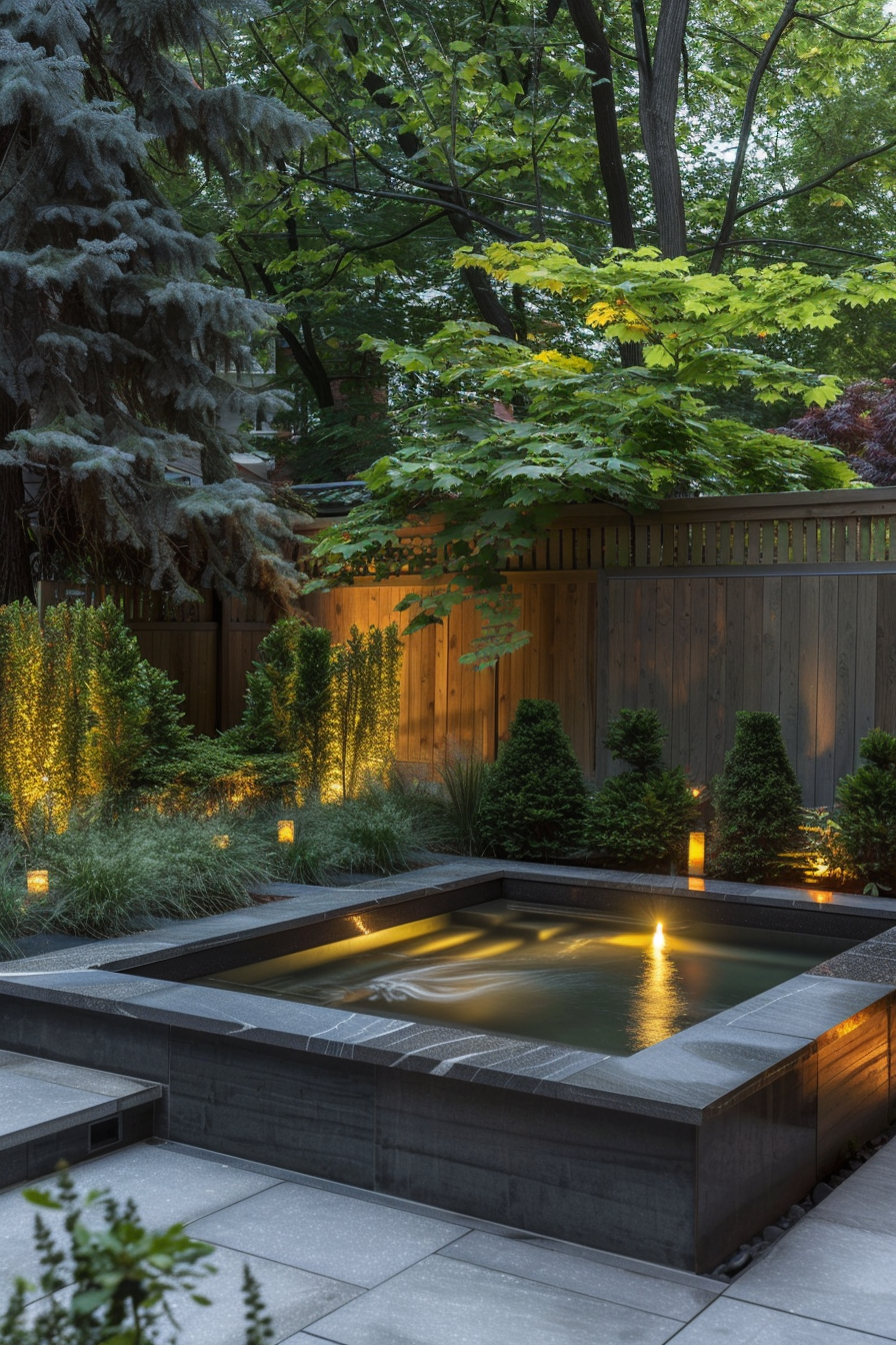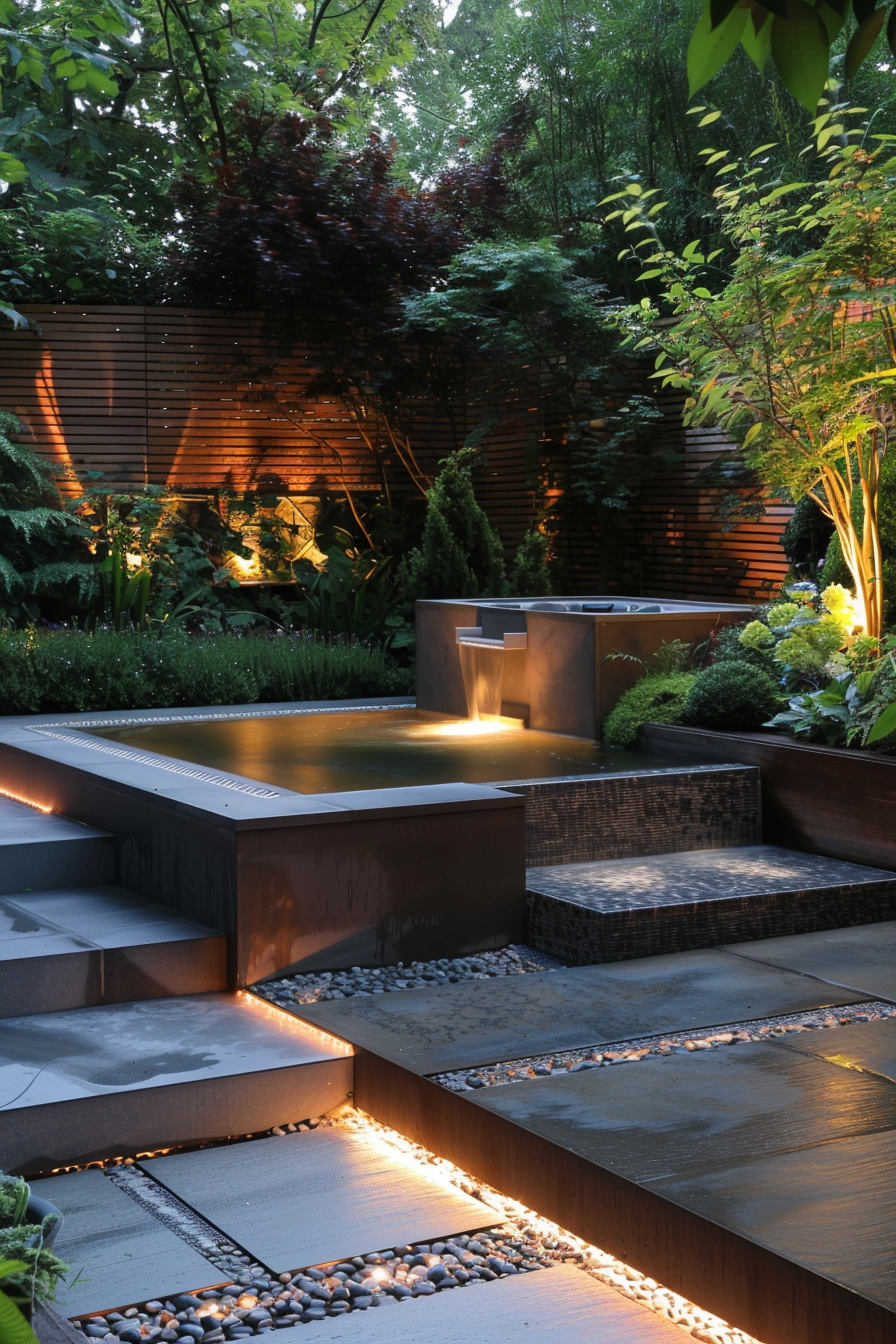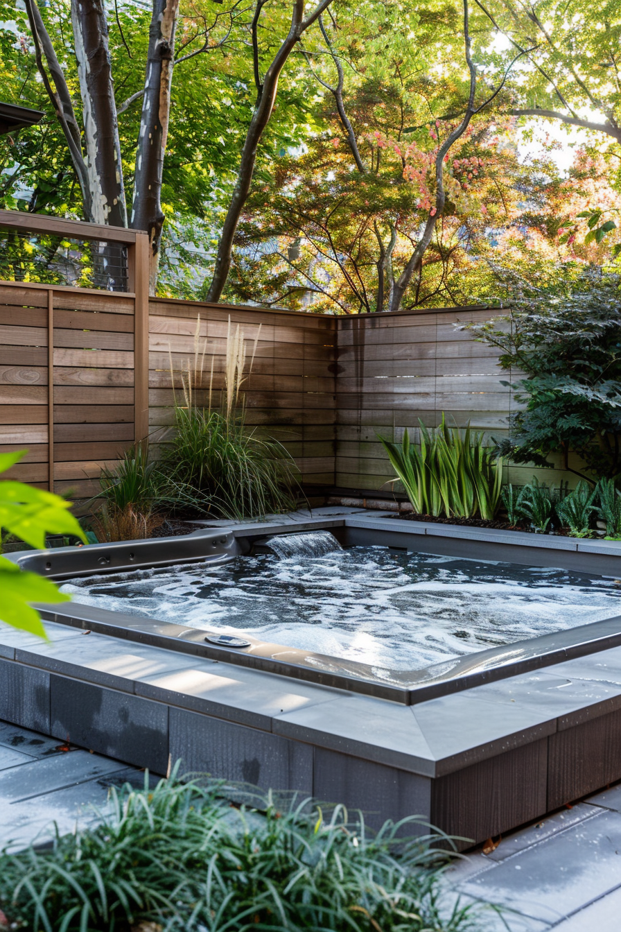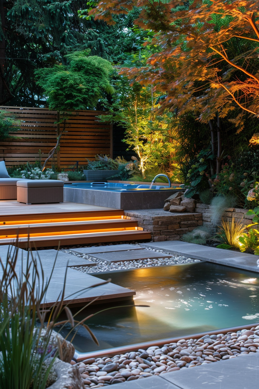 Here, a compact spa sits surrounded by lush greenery, with its soft glow reflecting off the water. Seasonal plants frame the space, making sure it looks beautiful all year.