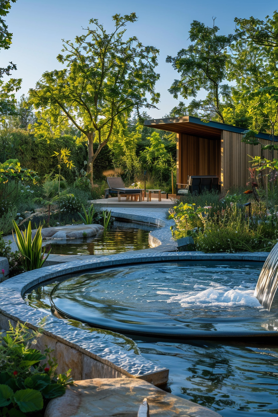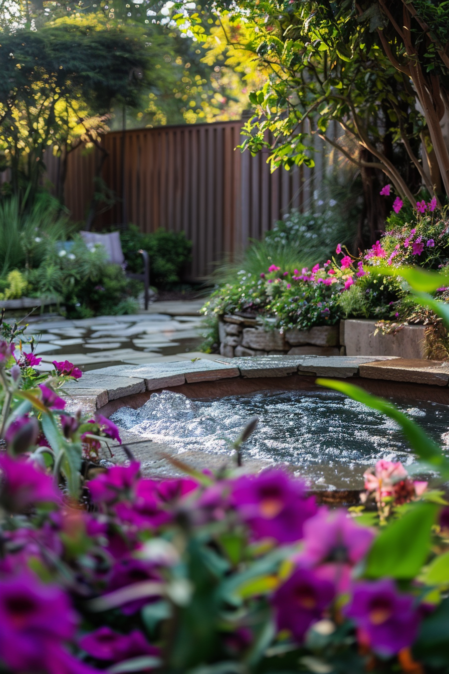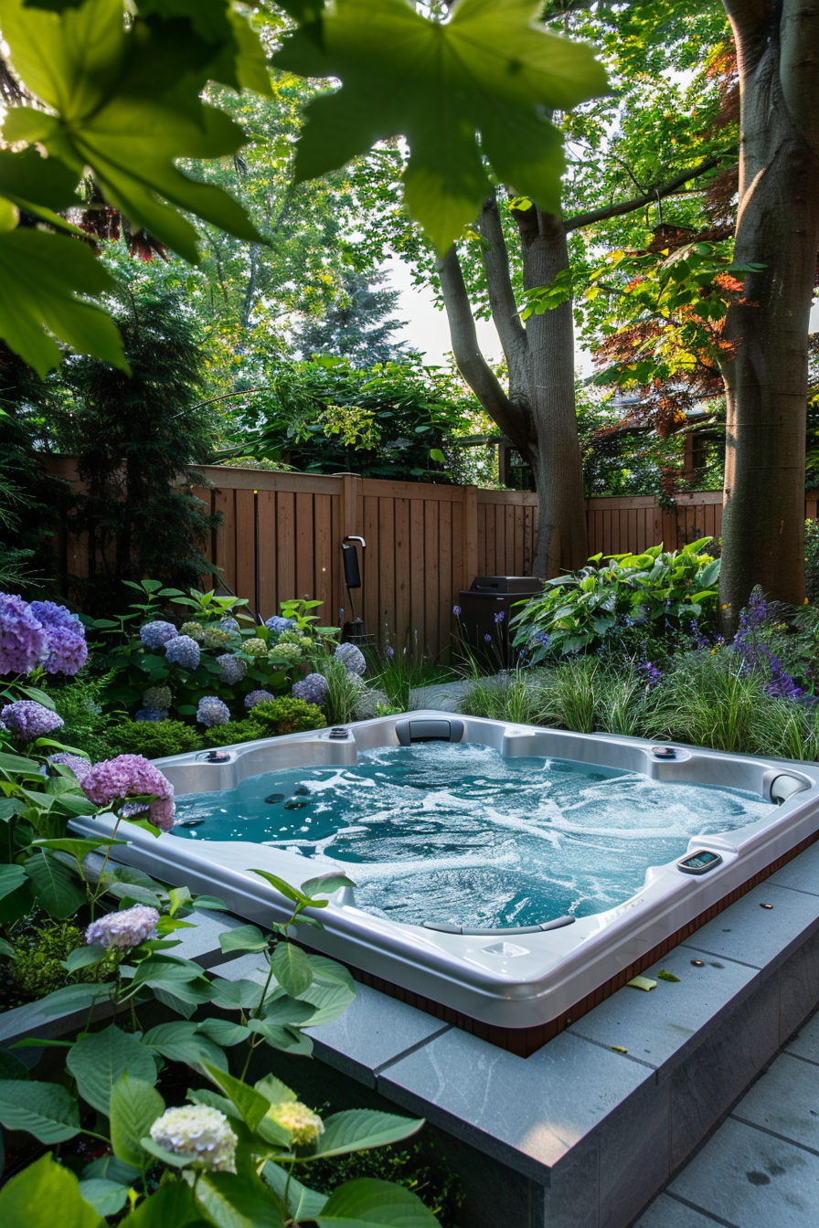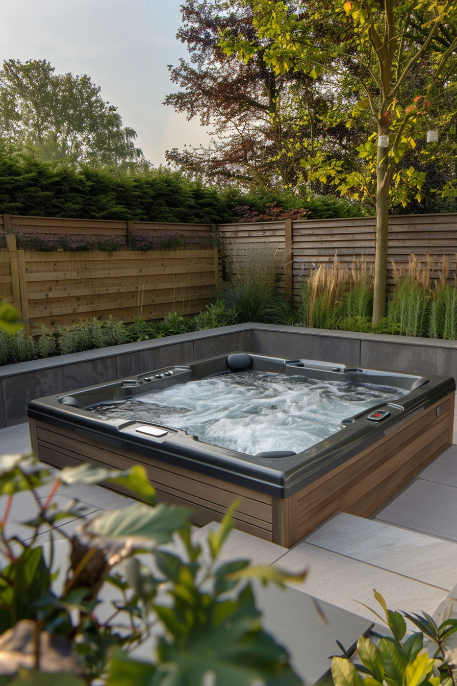 Here, a compact spa sits surrounded by lush greenery, with its soft glow reflecting off the water. Seasonal plants frame the space, making sure it looks beautiful all year.