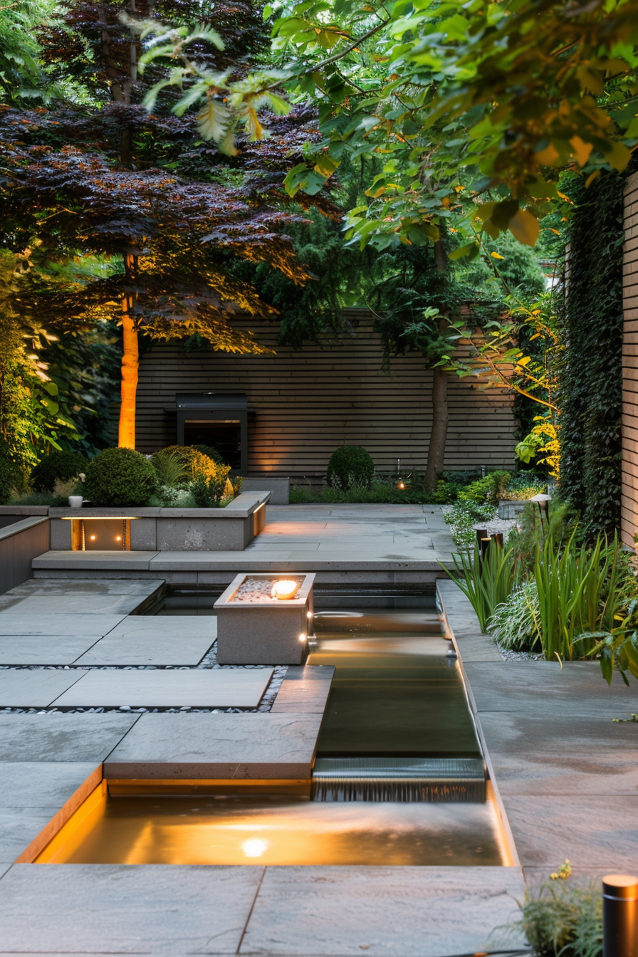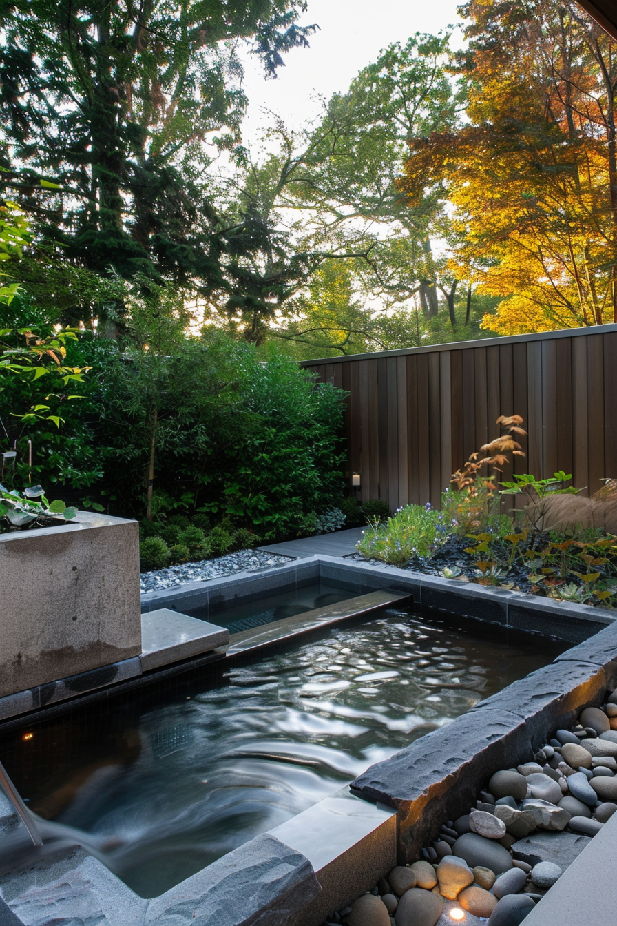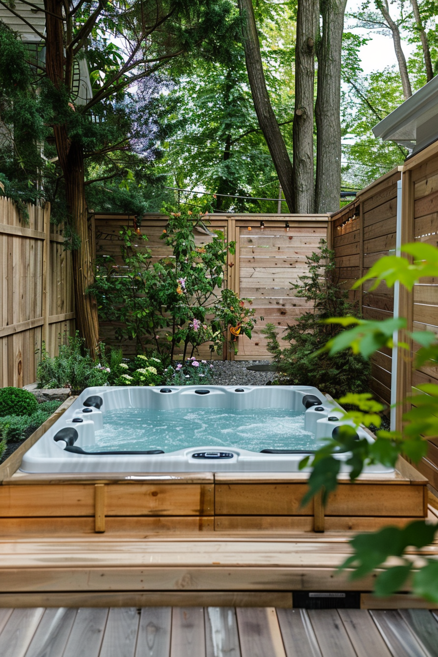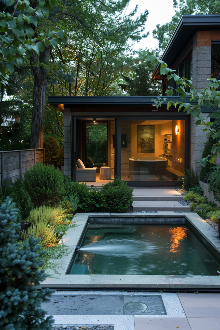 Here, a compact spa sits surrounded by lush greenery, with its soft glow reflecting off the water. Seasonal plants frame the space, making sure it looks beautiful all year.