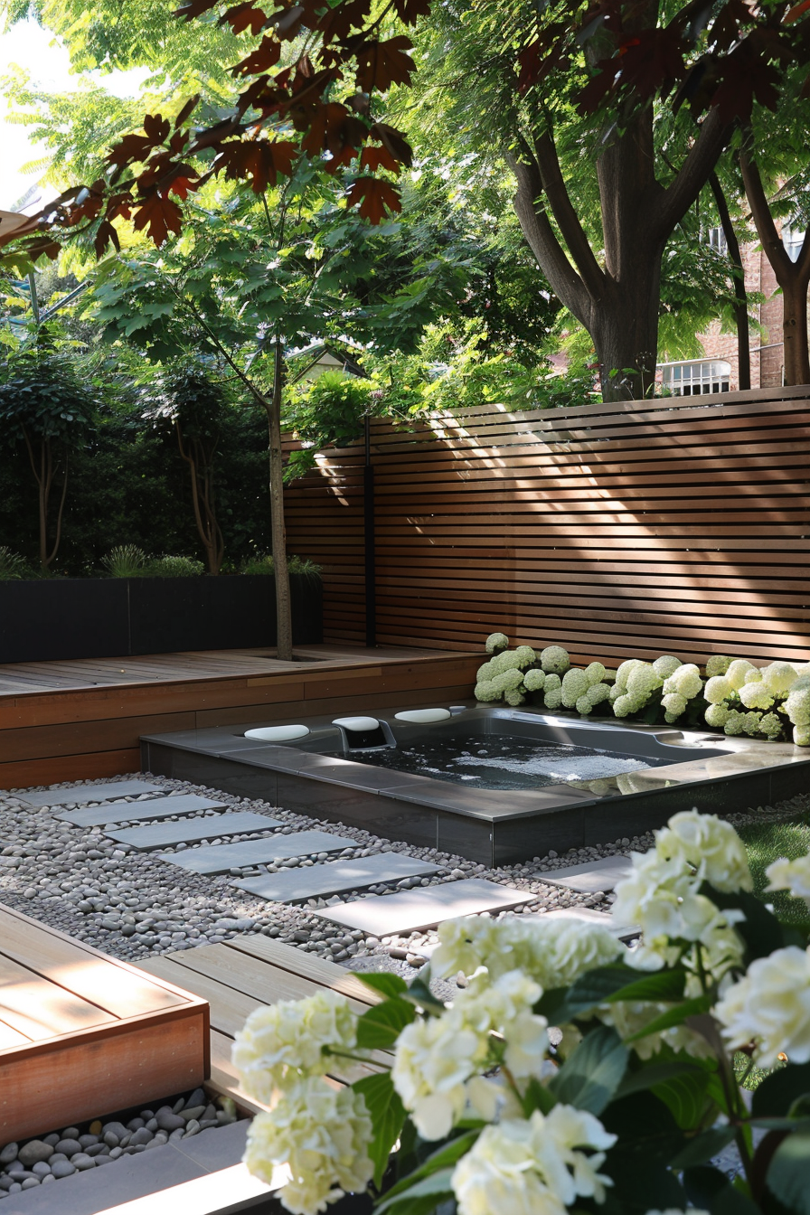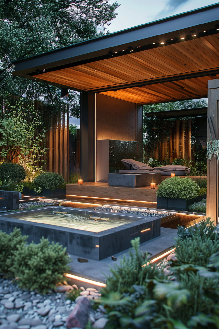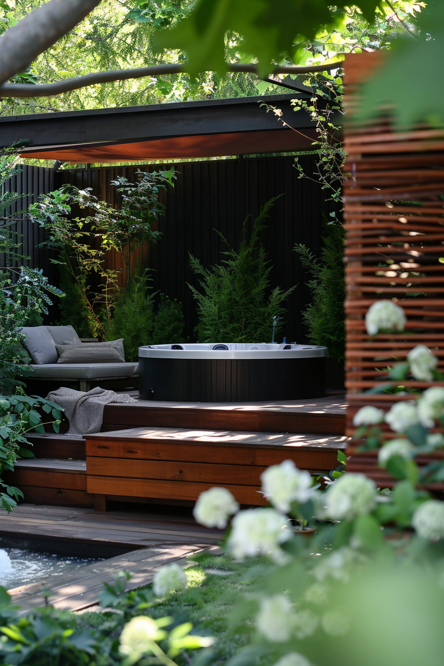 The subtle fragrance of flowers fills the air, mixing with the steam from the hot tub. It’s all about clean lines and natural materials, creating a space that just feels right.
