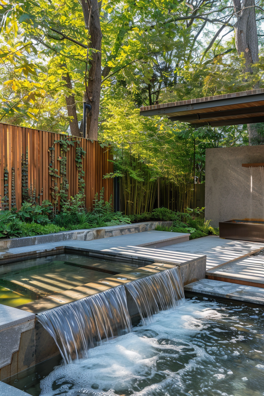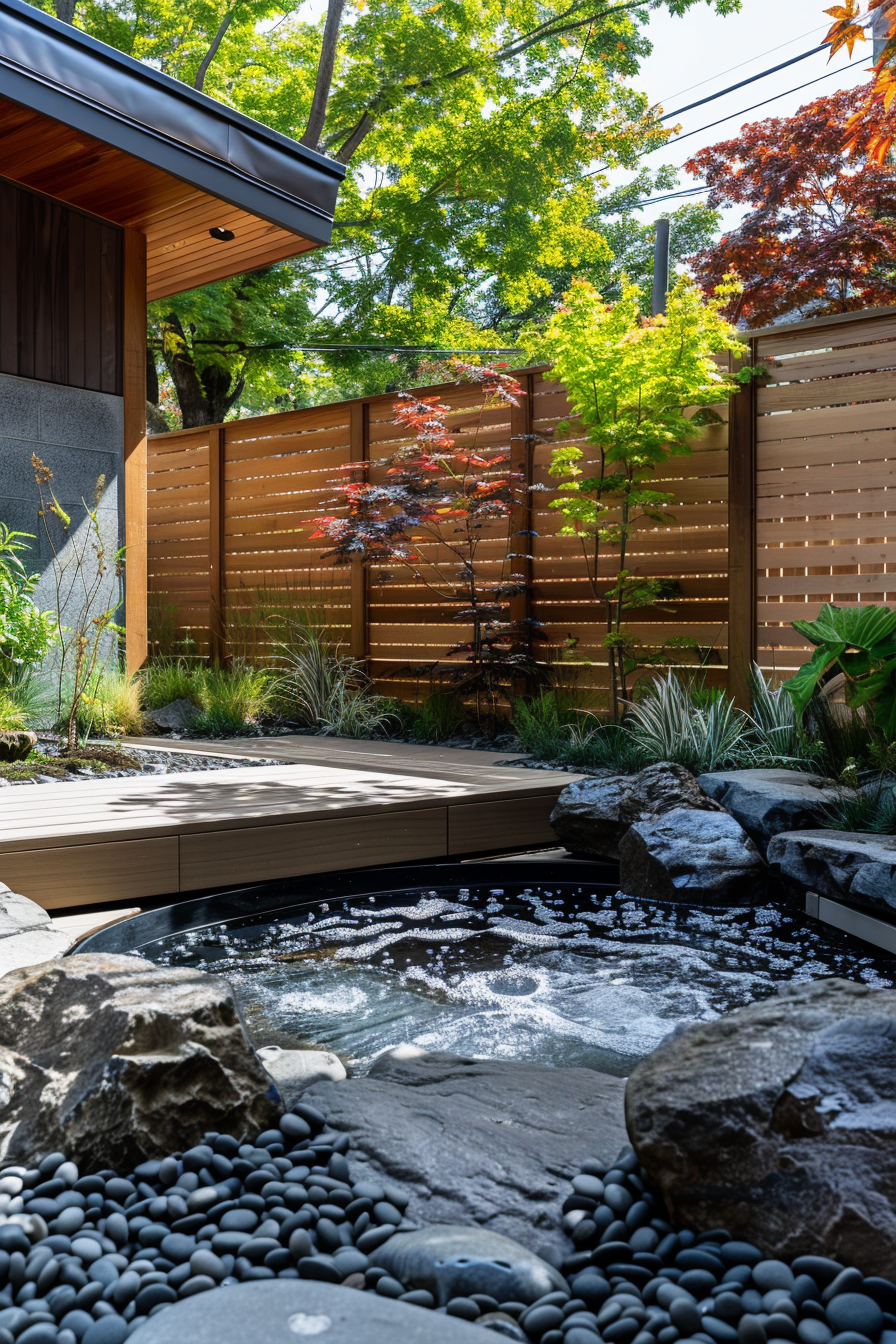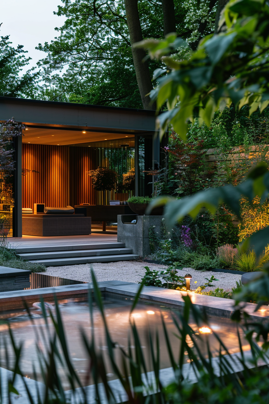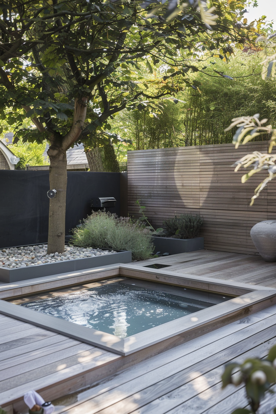 The subtle fragrance of flowers fills the air, mixing with the steam from the hot tub. It’s all about clean lines and natural materials, creating a space that just feels right.