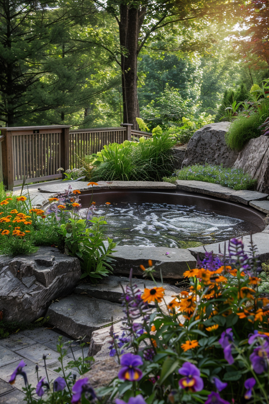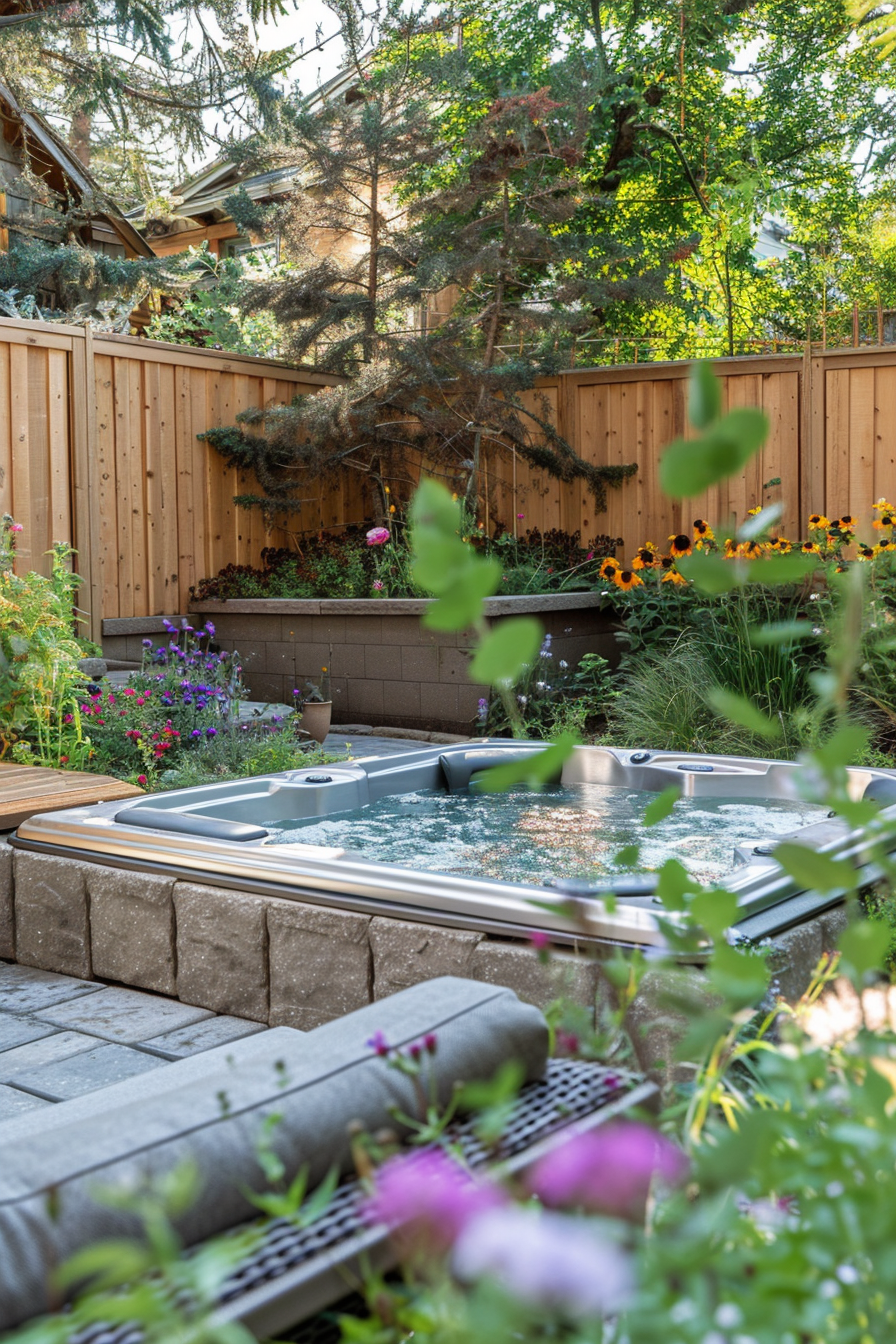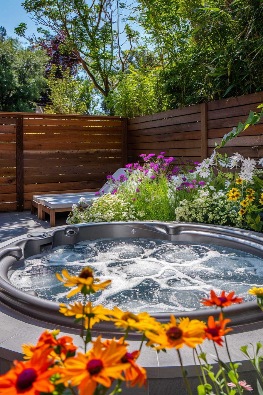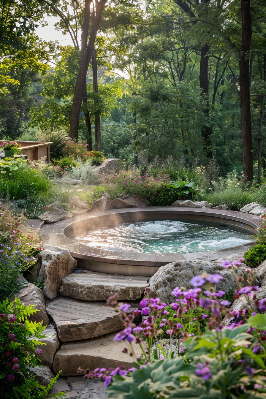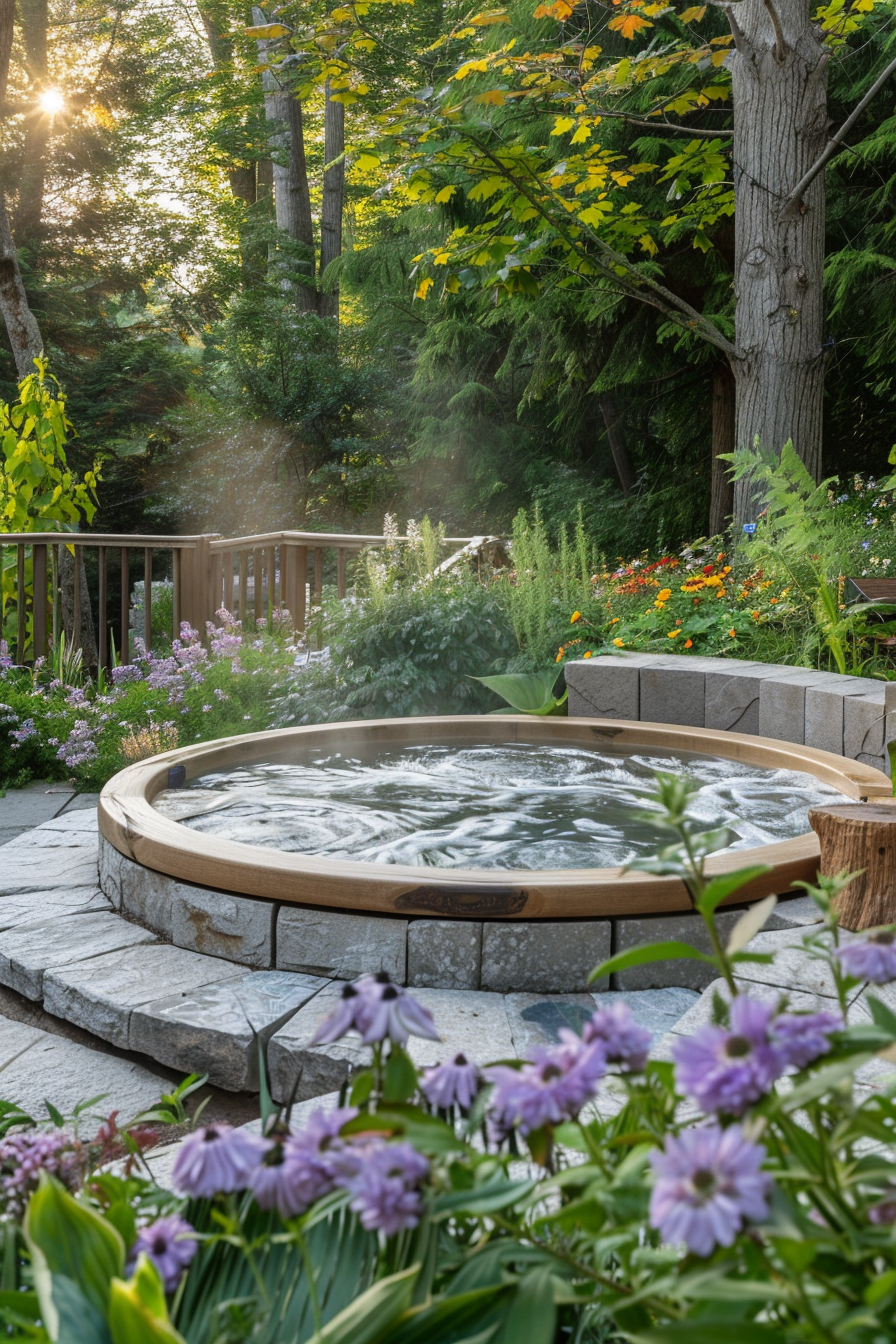 This spa sits right in the middle of a thoughtfully laid-out garden, with flowers that smell amazing, blending with the warmth of the hot tub.