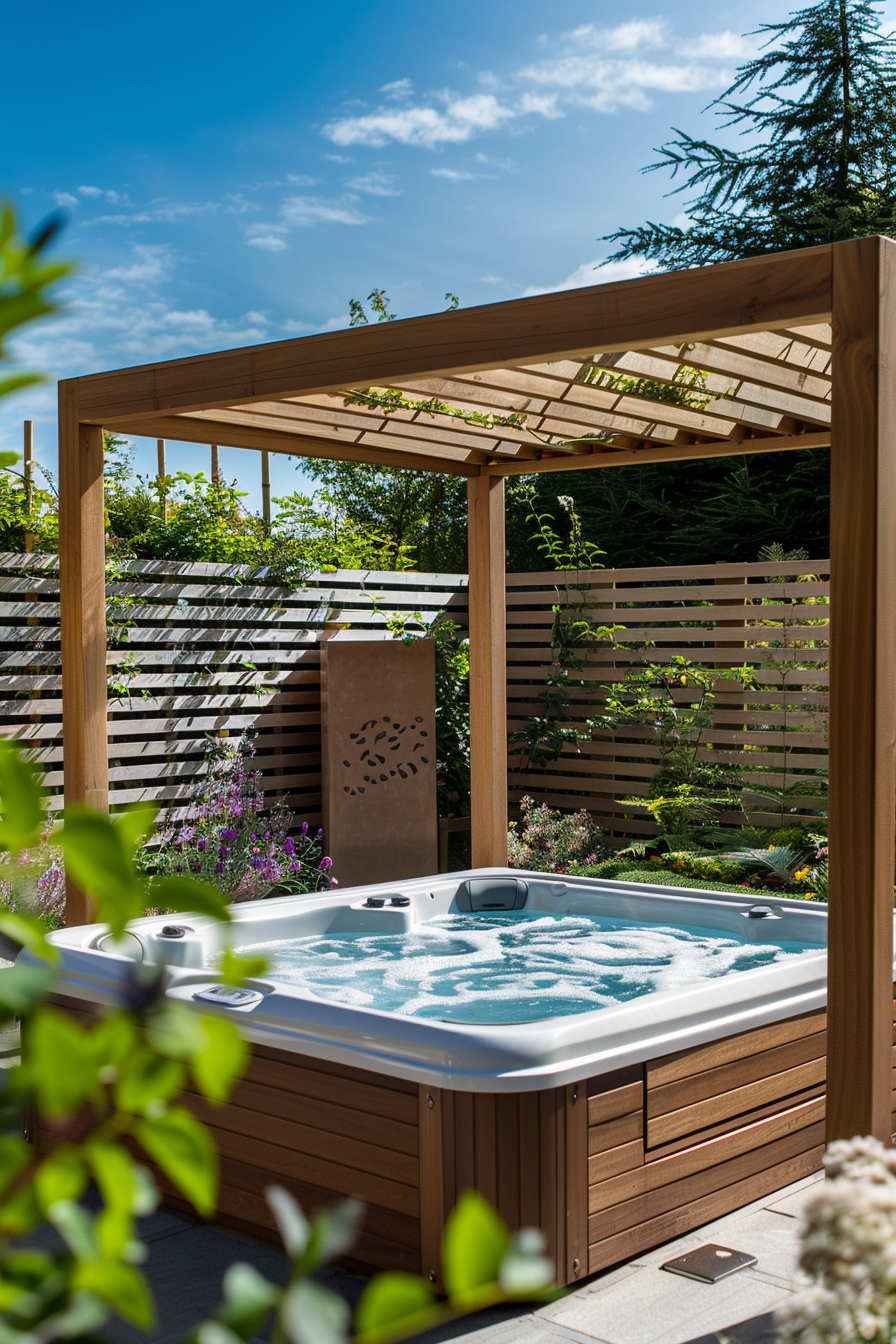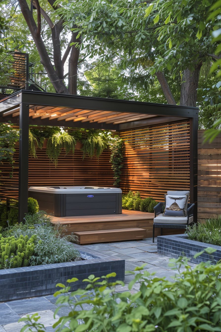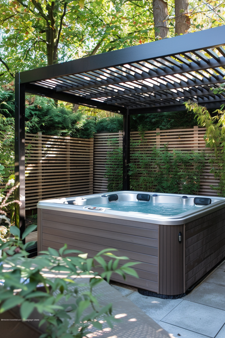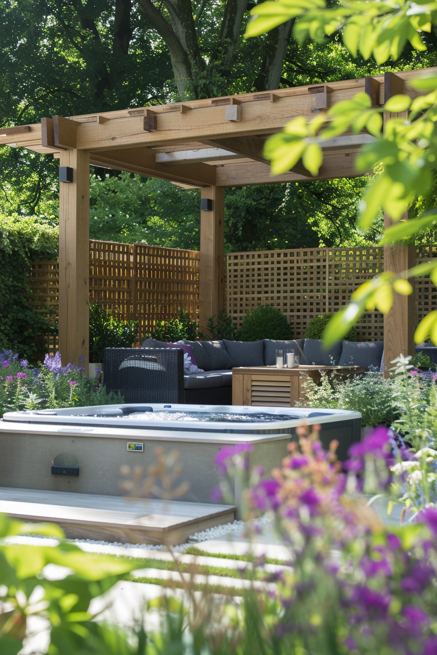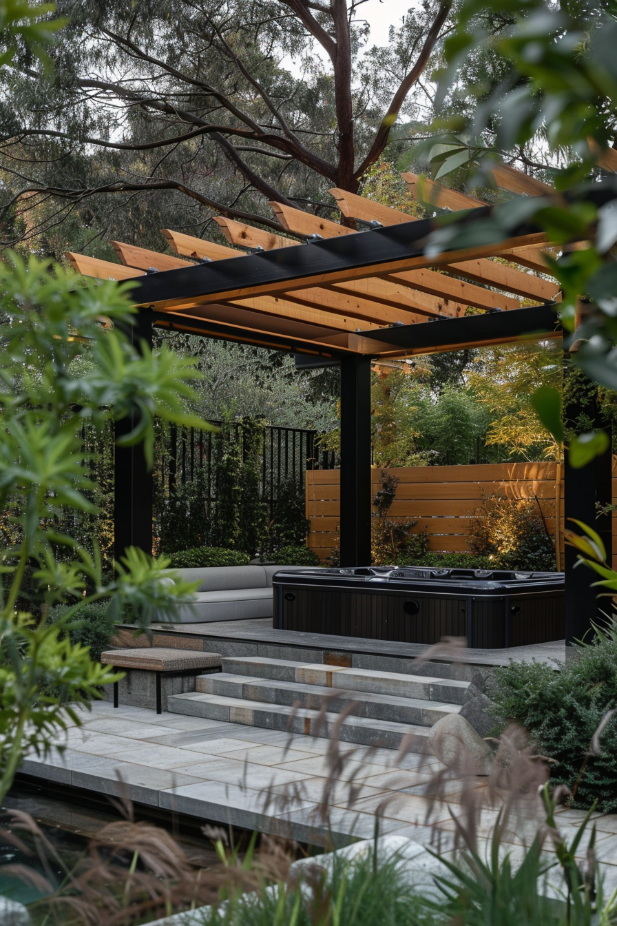 That’s the vibe here. The pergola shelters the hot tub, balancing privacy and openness.