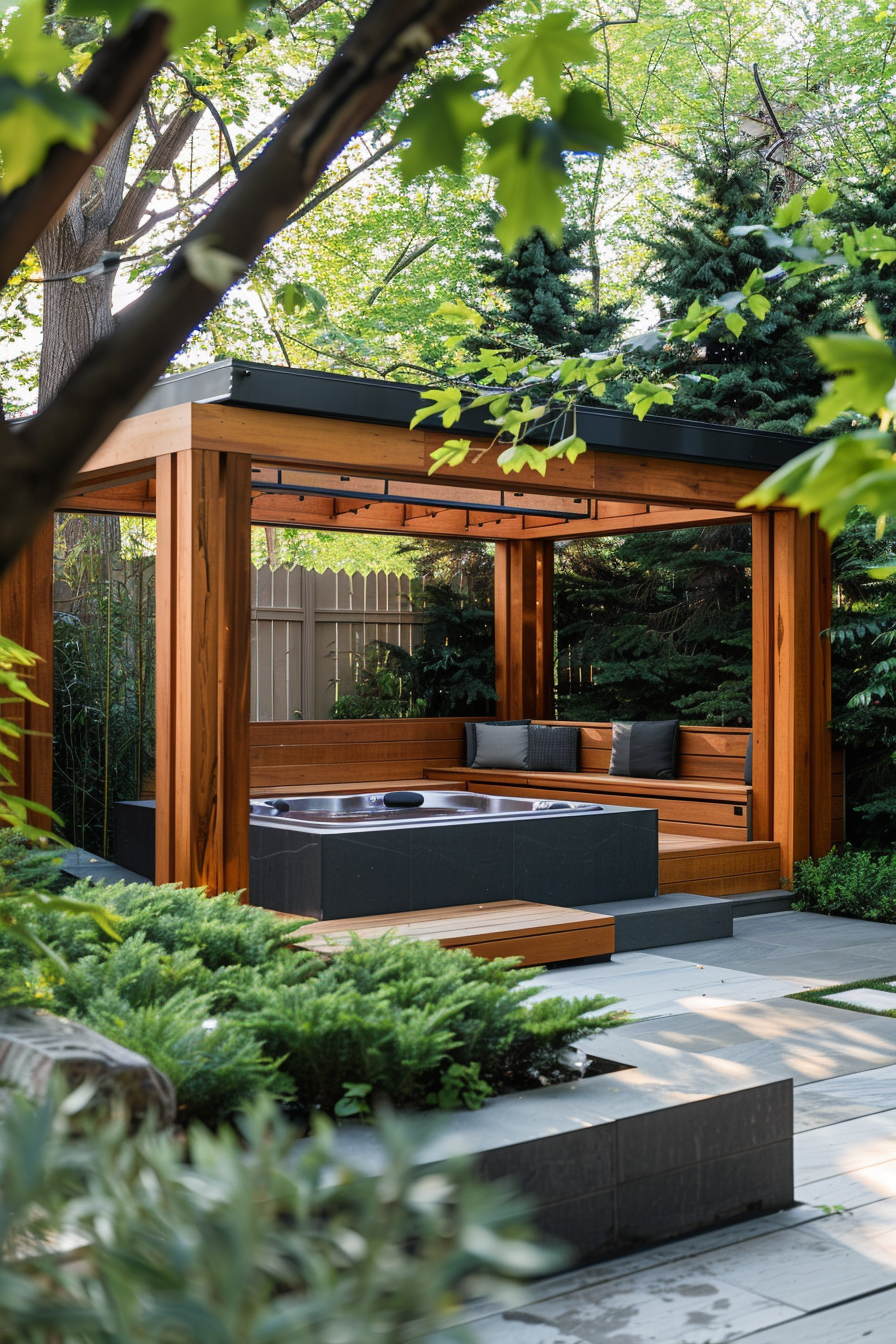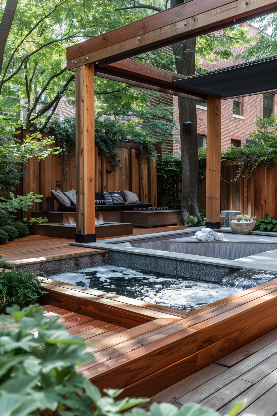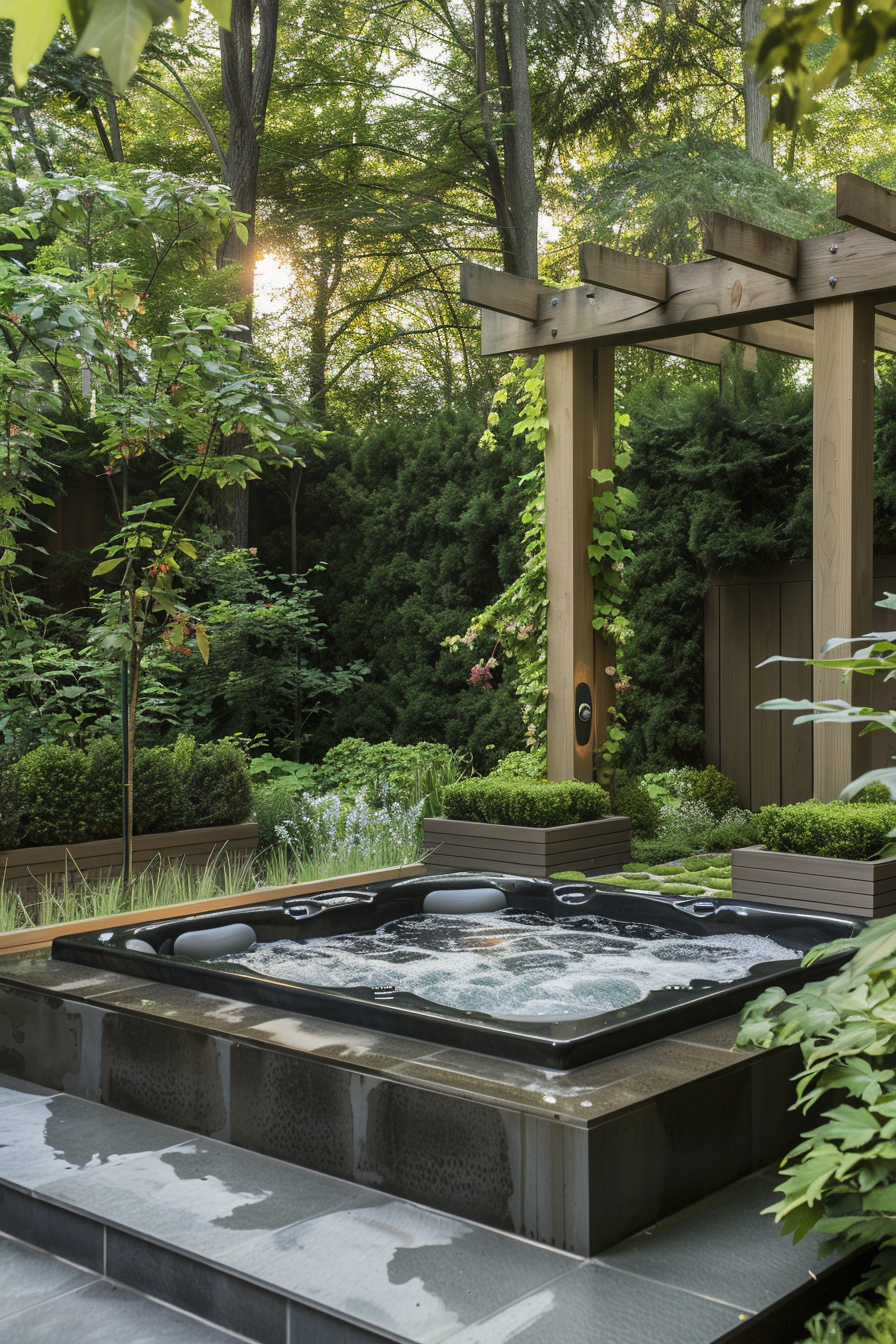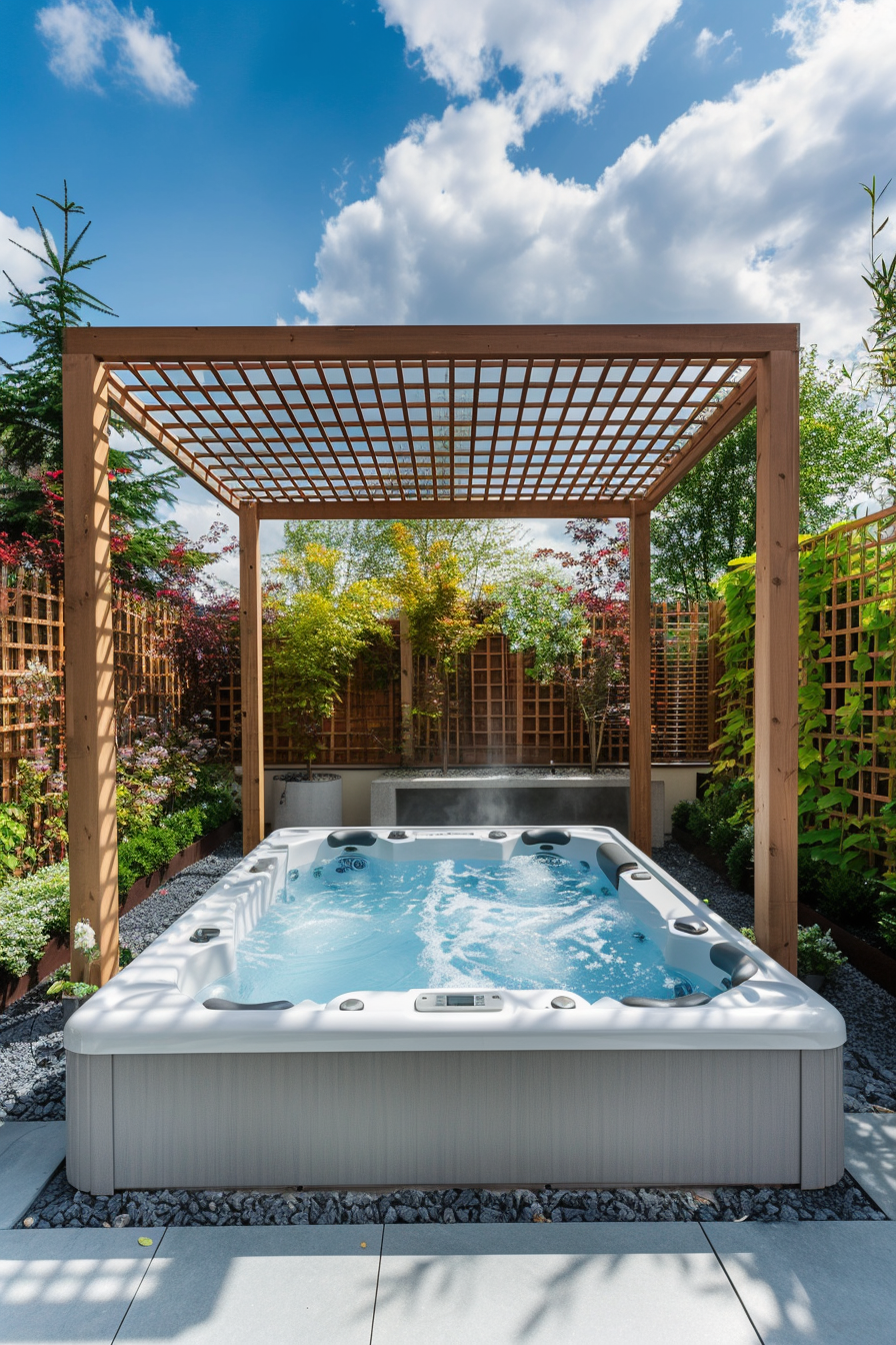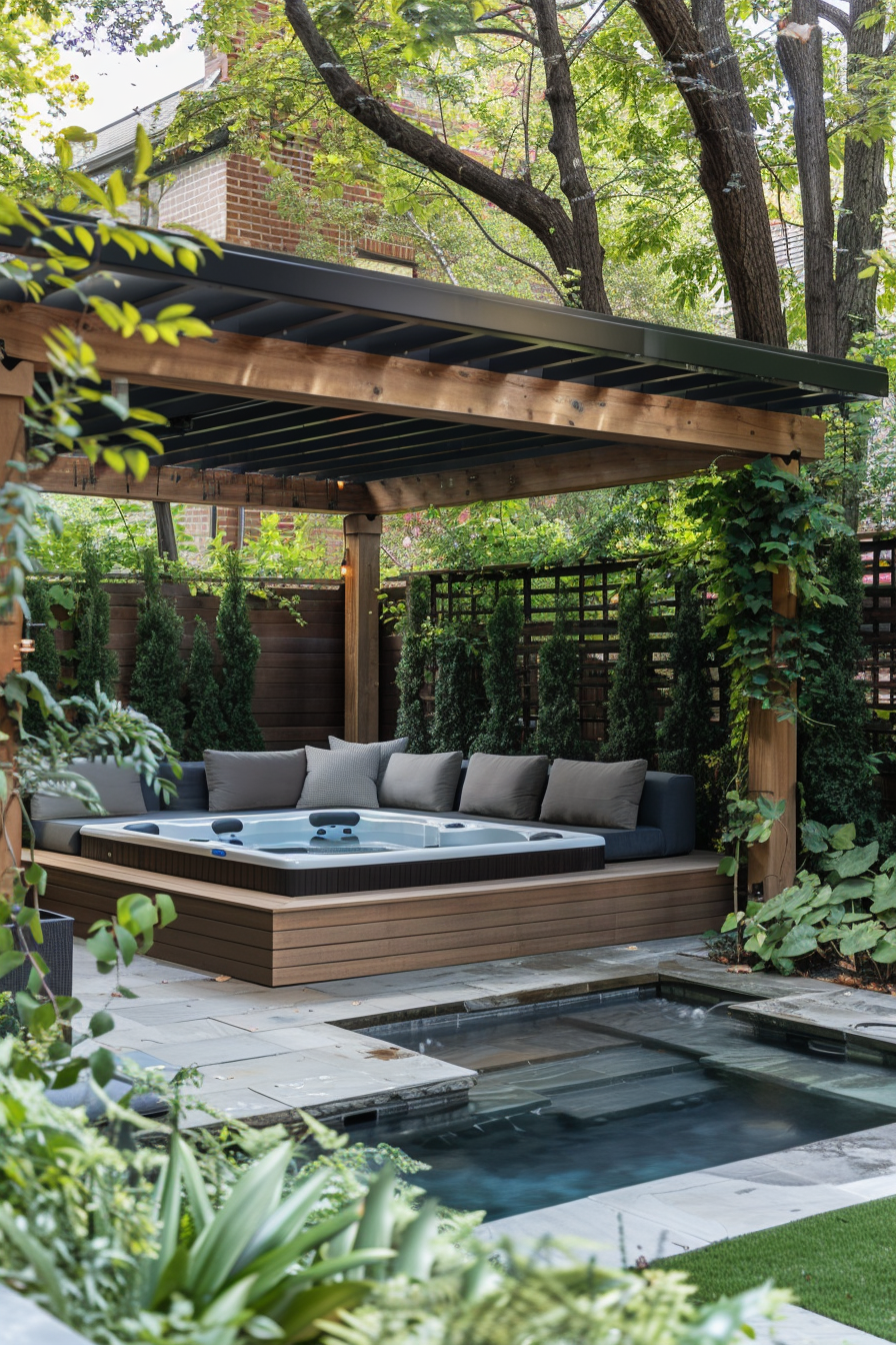 That’s the vibe here. The pergola shelters the hot tub, balancing privacy and openness.