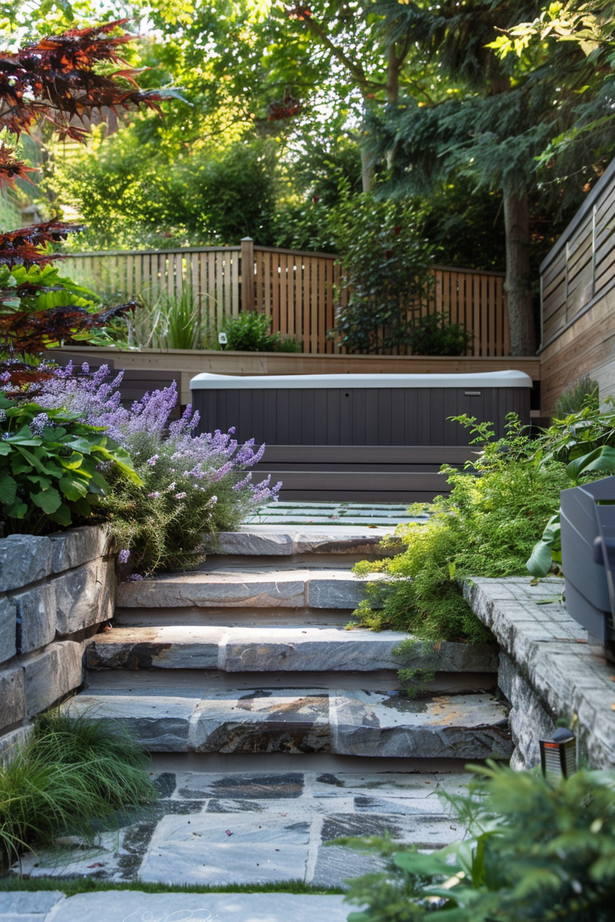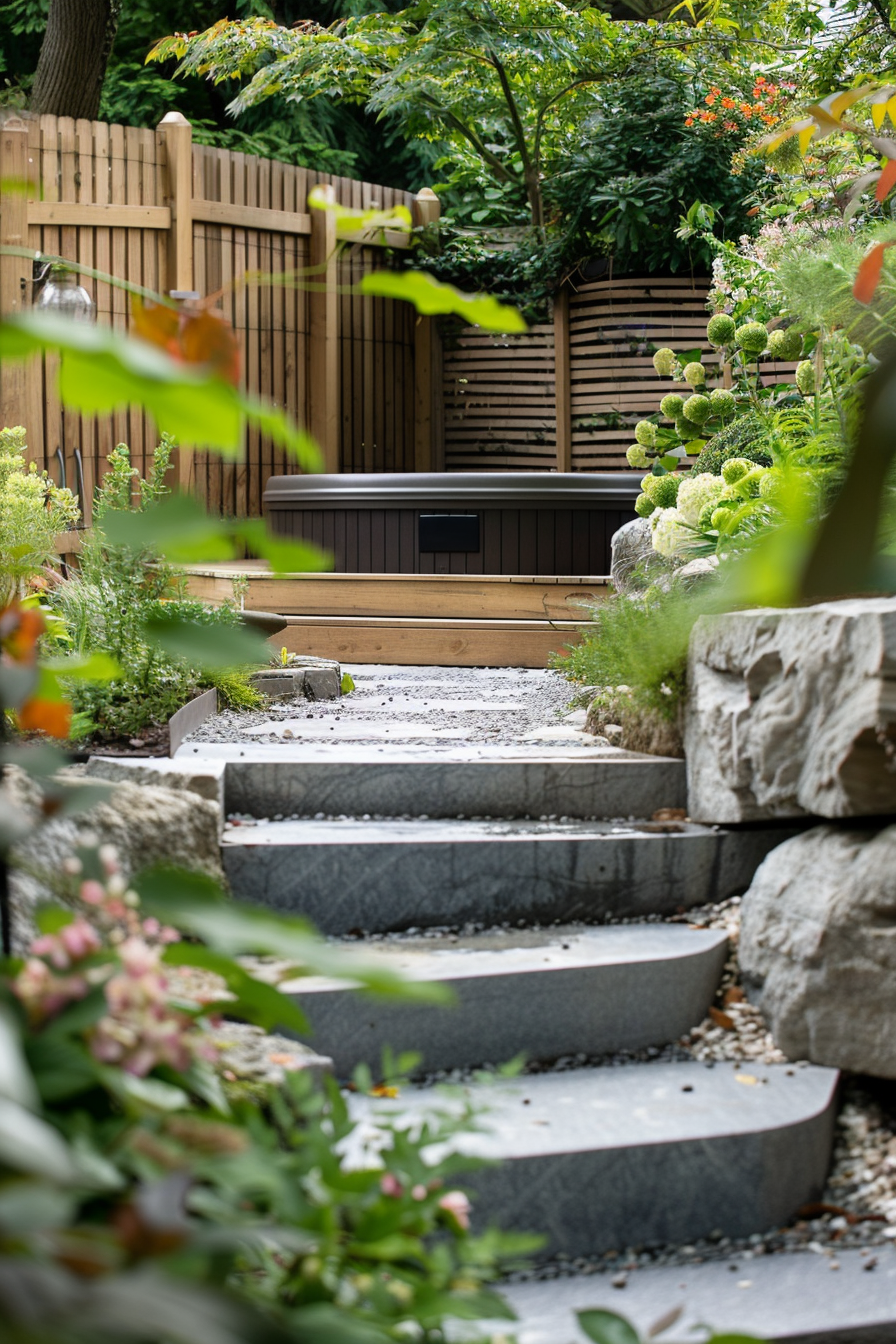 There’s something about spaces that make you slow down. This hot tub garden does just that. Worn stone paths weave through fragrant flowers, leading straight to the tub. It has that timeless, grounded feel.