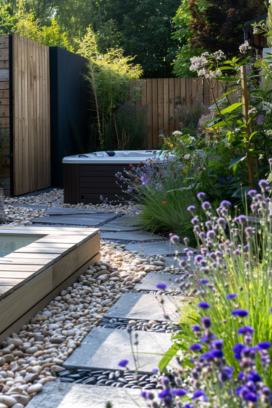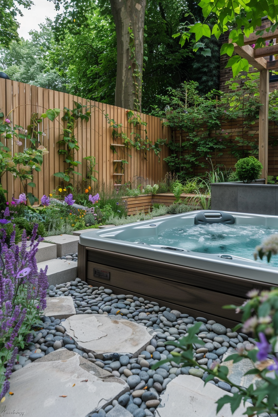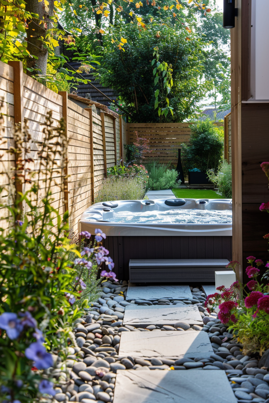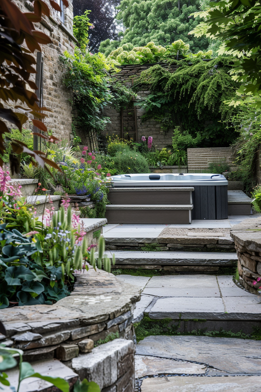 This hot tub, nestled along soft stone paths, fits perfectly into the UK garden vibe.