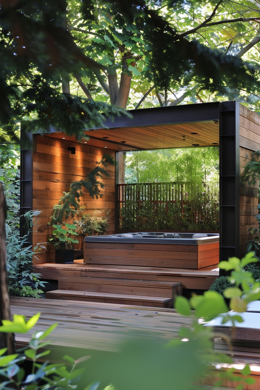 This covered spa area, with its warm wooden decking, feels super inviting.